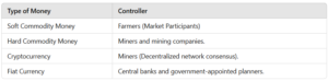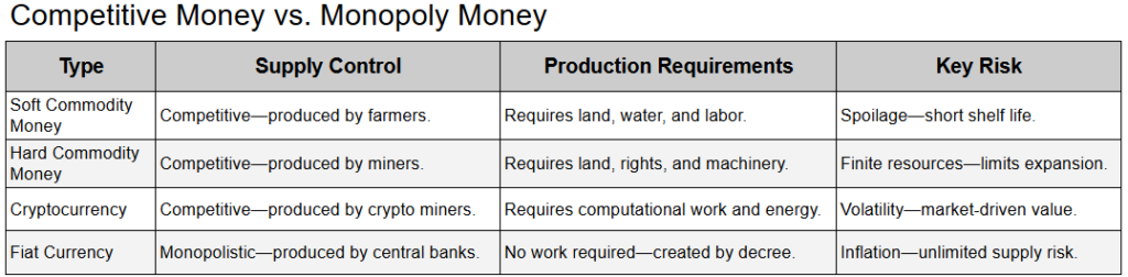 - Commodity Money (soft and hard) and cryptocurrency rely on competition for production: